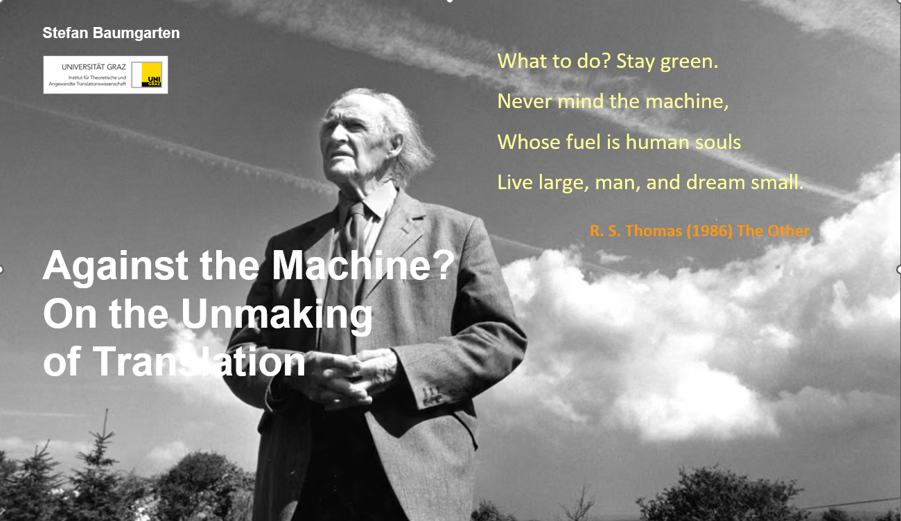 „Vor einer Woche wurde ich zum XXIII. Symposium on Translation and Interpreting Studies in Joensuu in Ostfinnland eingeladen, das in diesem Jahr unter dem Titel Conflict and Harmony stand. Vielen Dank für den herzlichen Empfang und dafür, dass sich die Zuhörerinnen und Zuhörer auf meinen Versuch eingelassen haben, die eher ausbeuterischen Seiten der Translation freizulegen. Die Keynote trug den nicht ganz bescheidenen Titel „Against the Machine? On the Unmaking of Translation“ – wobei sie sich von Paul Kingsnorths Buch Against the Machine: On the Unmaking of Humanity inspirieren ließ – übrigens eine sehr empfehlenswerte Lektüre …“